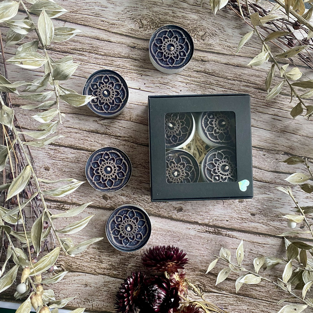 Hallo, wir sind deine Mandala-Teelichter – kleine Lichtkunstwerke für Momente voller Ruhe und Inspiration! Mit filigranem Mandala-Muster, feinem Glitzer und dem belebend-warmen Duft von Eukalyptus, Kaschmir und Patschuli bringen wir Harmonie und Ruhe in dein Zuhause. Ideal für achtsame Rituale, entspannte Abende oder als besonderes Geschenk, das von Herzen kommt.